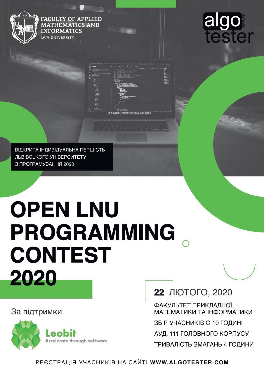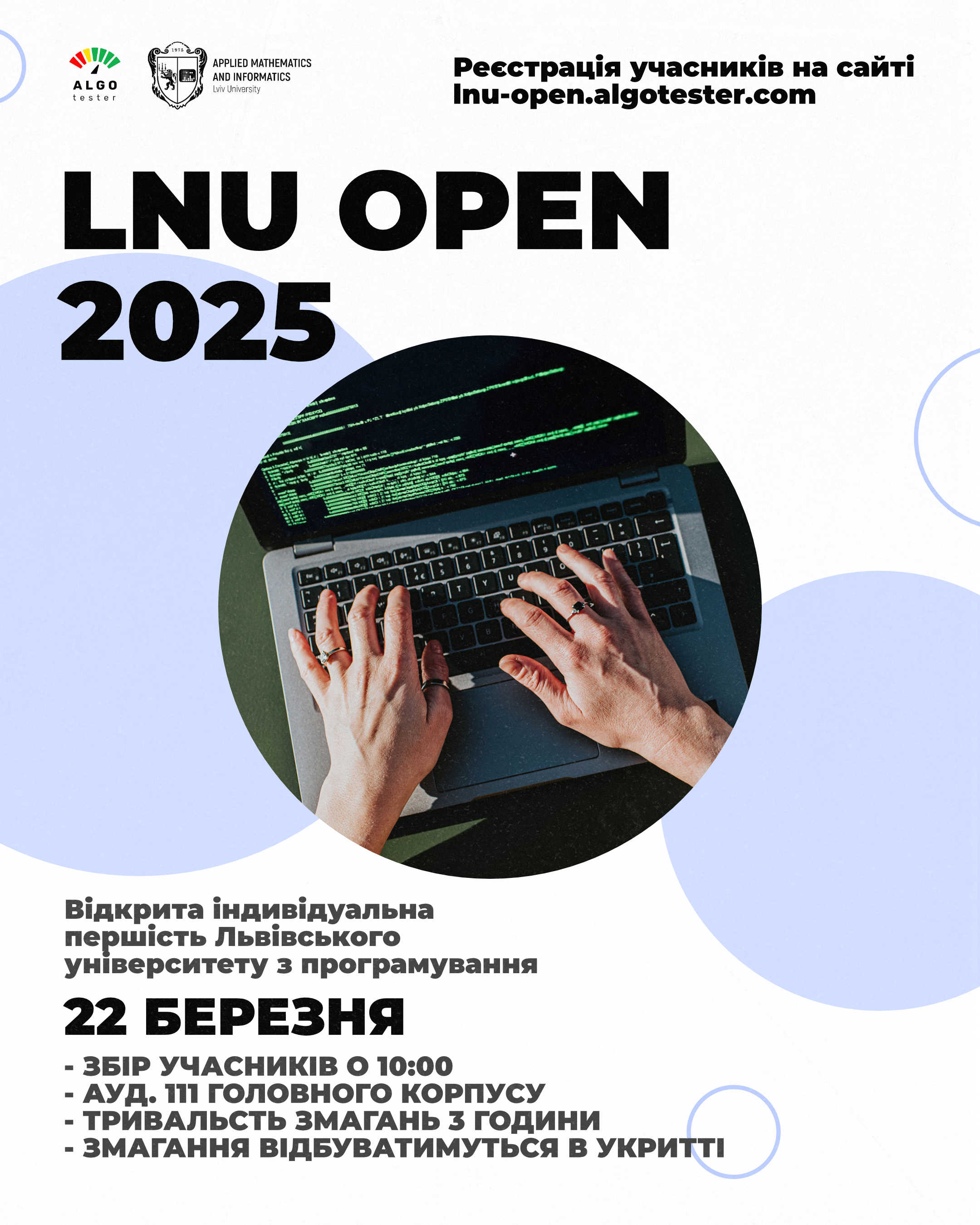Запрошуємо всіх охочих взяти участь у щорічній відкритій індивідуальній першості з програмування Львівського національного університету імені Івана Франка, що відбудеться у суботу 22 березня у головному корпусі університету. Змагання триватиме 3 години та проходитиме в очному форматі в аудиторіях, що розташовані в укритті. У конкурсі можуть брати участь всі студенти закладів вищої, професійної або фахової освіти, а також учні закладів середньої освіти України.
